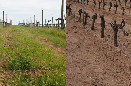 Two vineyards 100 m apart. One treated with herbicide, the other allowed to grow a cover crop.