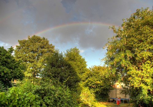 We had a lot of rain today. Several torrential downpours. The forecast for the next few days is good, with temperatures remaining high, but perhaps a little less sunshine than of late. Pictured above is our back garden this evening, with an attractive rainbow in between the showers. You can see the row of vines in the foreground.