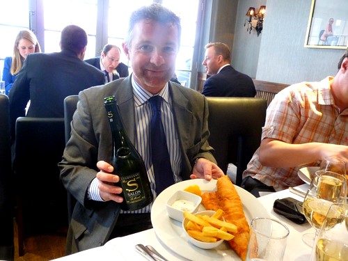 But rather than match this aristocratic fizz with a Michelin-starred menu, Corney & Barrow had the fun idea of launching Salon’s latest release with good old fish and chips, at Geales fish restaurant in Notting Hill – an upmarket yet traditional fish and chip joint. It was an inspired idea. Pictured above is Salon’s president, Didier Depond, with his lunch.