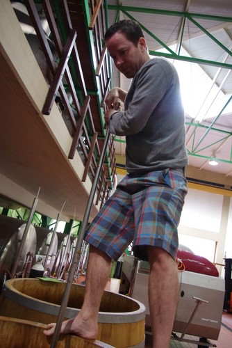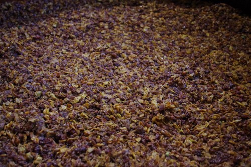 Then the naturally dried, late harvest grapes are picked. They’re fermented on the skins, with manual punchdowns. This helps add phenolic depth to the wine, and also helps with juice yield from the raisined grapes. Sam Harrop had a go at punching down the cap on one of these fermenters.