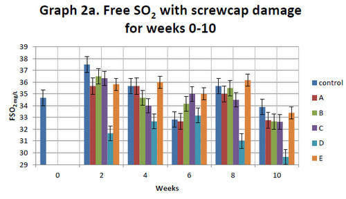 There were 84 controls and 72 wines in each category, with the damage inflicted artificially on each damaged bottle to the appropriate level. The wines were stored for 10 weeks, and a number examined chemically at two week intervals, with the largest sample being at the end of the 10 weeks when the remaining bottles were tested. The chemical analysis was for absorbance at 420 nm (looking at browning, a marker of oxidation) and free and total sulphur dioxide (SO2, again a marker of oxidation). Sensory analysis was also carried out.