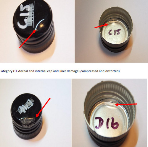 Eisermann-Ctercteko examined over 10 000 bottles for damage, and then purchased 600 bottles of a 2012 Sauvignon Blanc for chemical analysis. She did a formal trial of 444 bottles with increasing cap damage, which she classified from A-D in ascending severity. There was also a class E which was where the cap was undamaged but hadn’t been applied correctly.