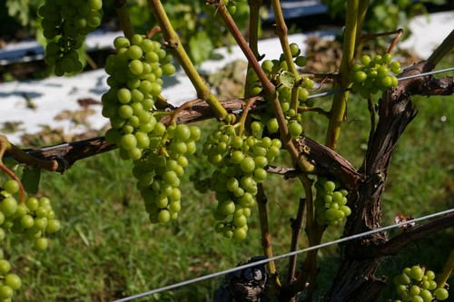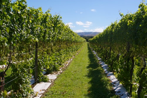 To further increase light exposure, a white reflective matting, called Extenday (website here) is placed under the rows. This reflects sunlight back onto the grapes.